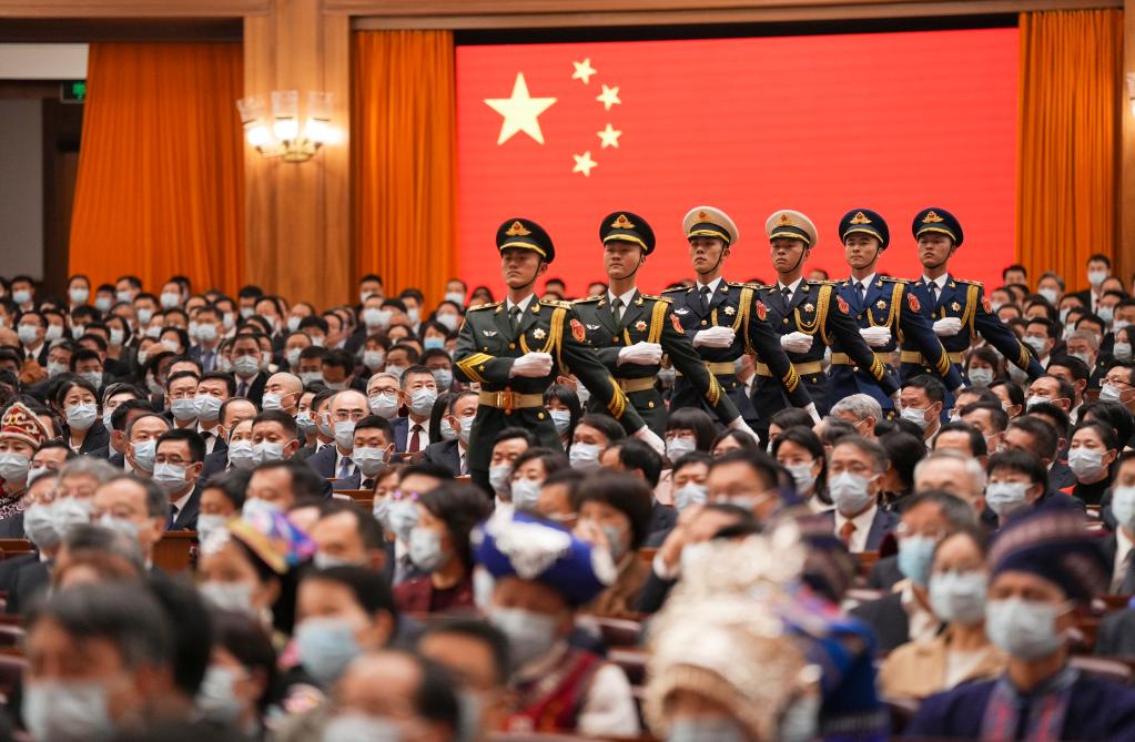 3月10日,中华人民共和国第十四届全国人民代表大会第一次会议宪法宣誓仪式在北京人民大会堂举行。这是陆海空三军仪仗兵正步行进。